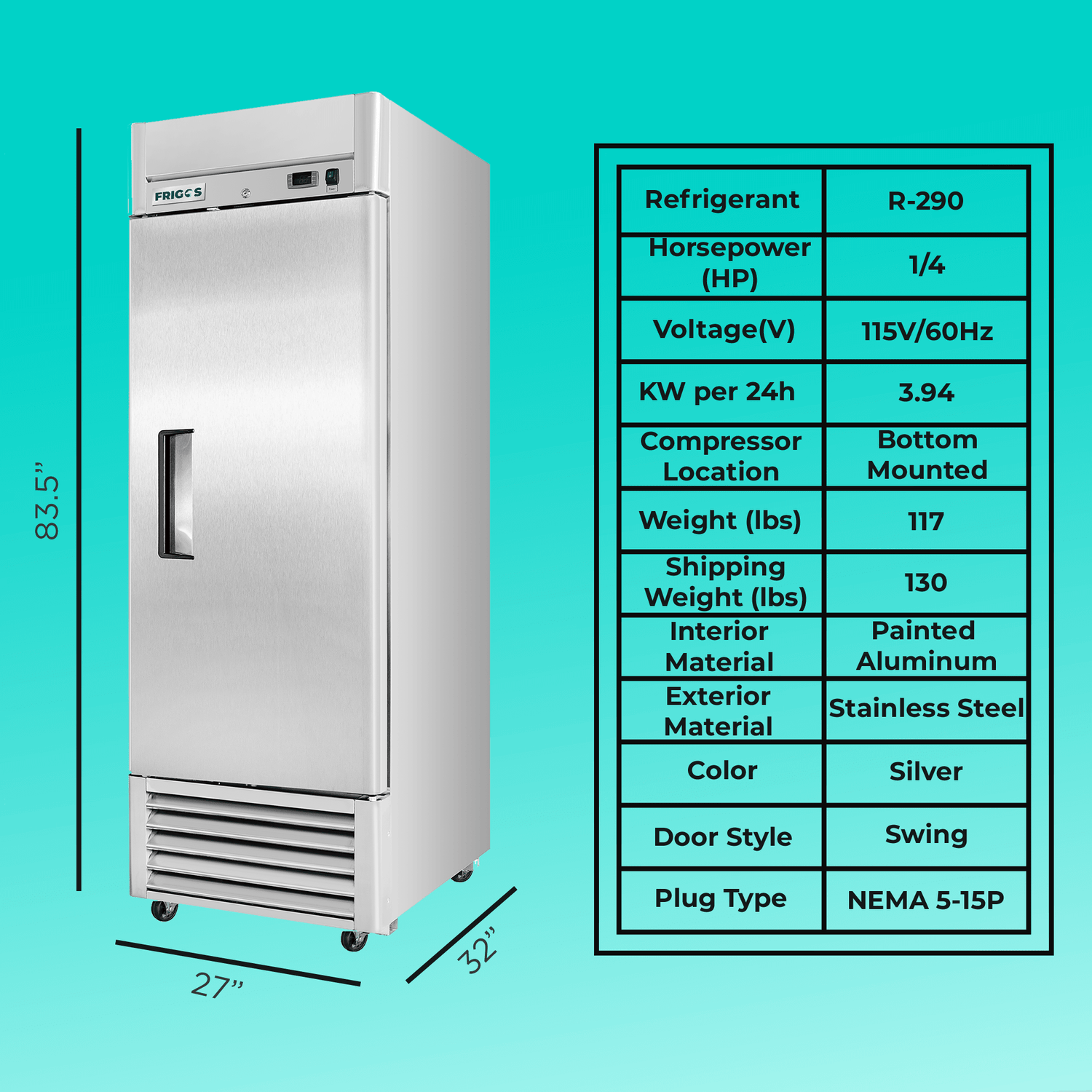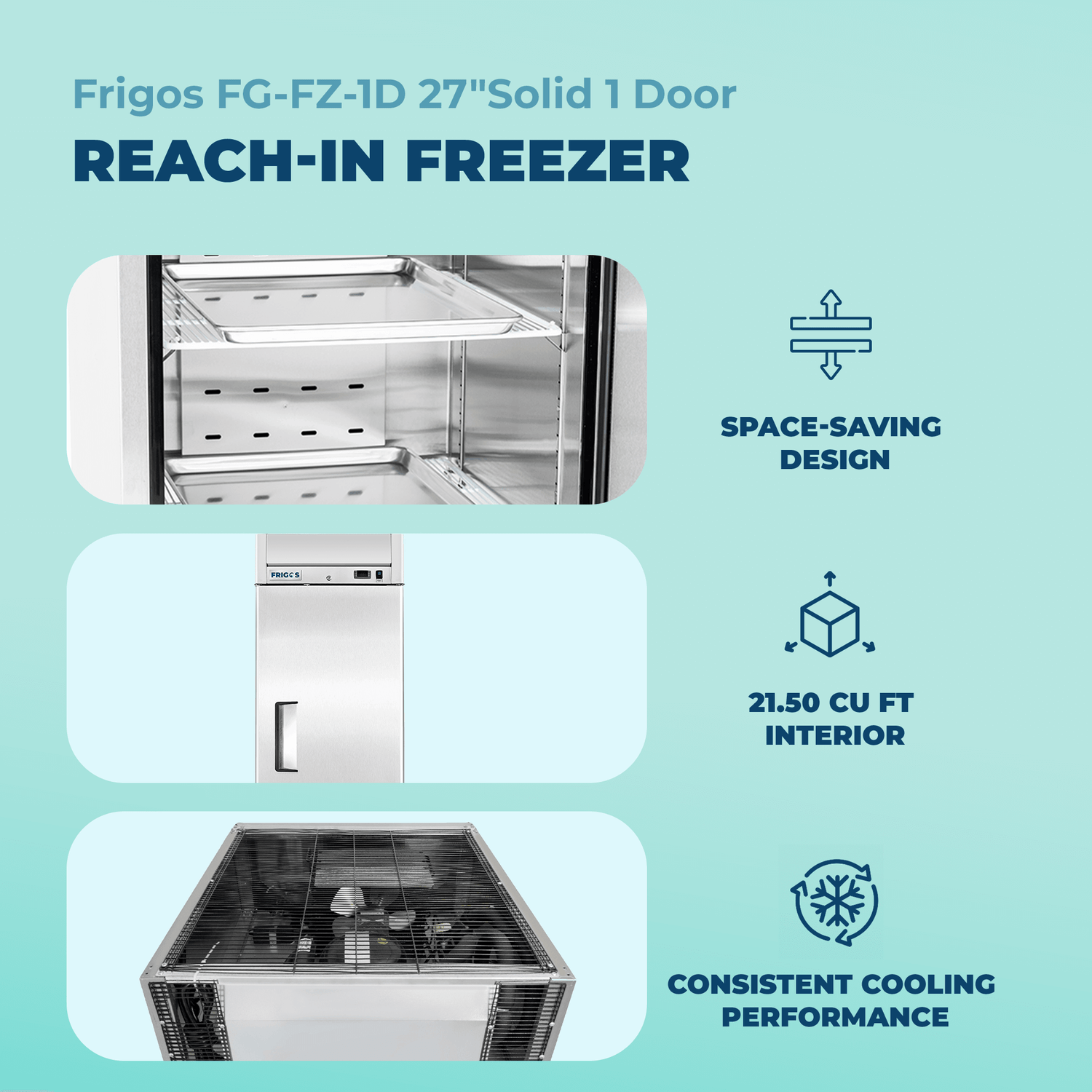 Commercial Reach in Freezer 27" Width Solid 1 Door 21 Cu Ft Frigos FG-FZ-1D with Aluminum Interior with 304 Stainless Steel Floor