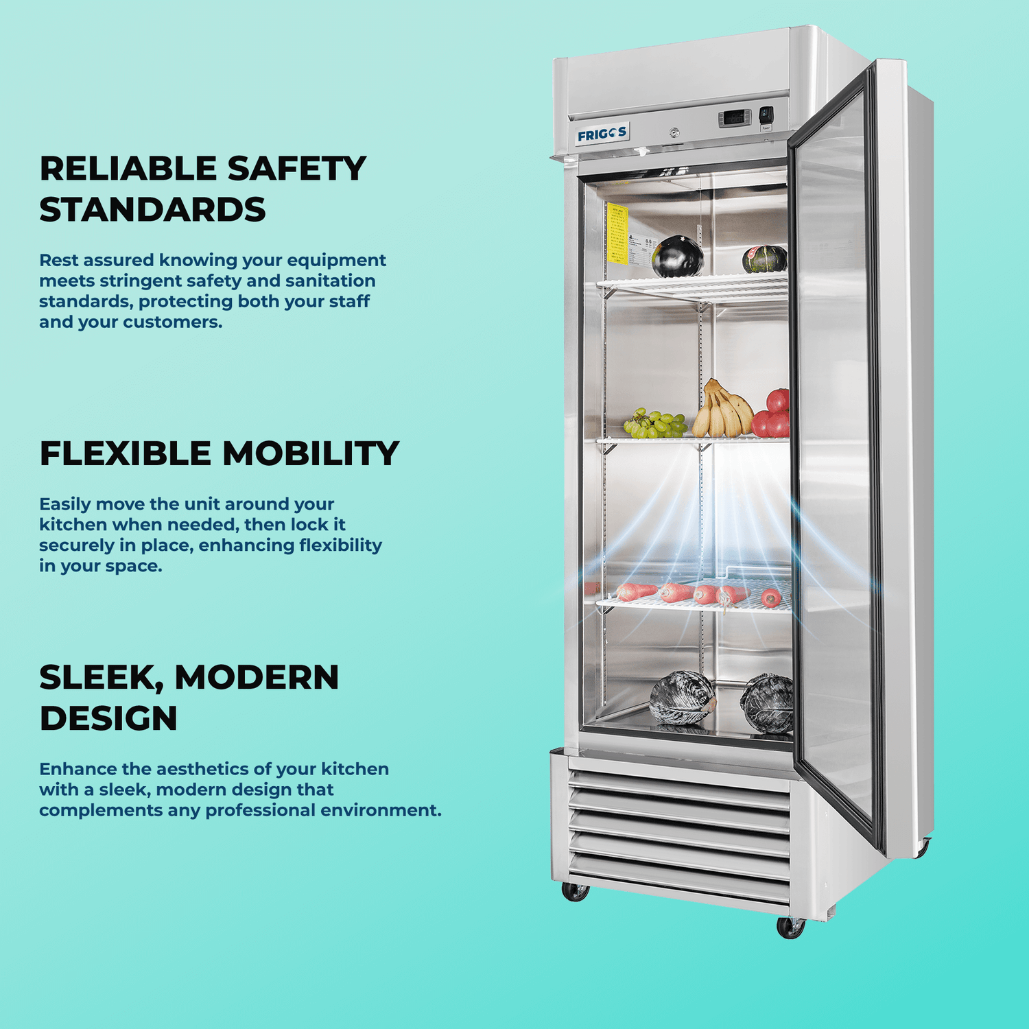 Commercial reach in freezer is equipped with three sturdy epoxy-coated shelves, each with the capacity to support up to 85 pounds, you'll discover generous storage space for your ingredients and products. Our Frigos Reach-In Freezer unit is designed to fit Hotel Pan Size of 12 x 20 inches. The integrated LED lighting guarantees exceptional visibility, simplifying the task of locating items within. The self-closing door enhances convenience and energy efficiency, securely locking when required. The unit's mobility is effortlessly facilitated by 4 7/8-inch casters, including two that can be locked into place to ensure stability.