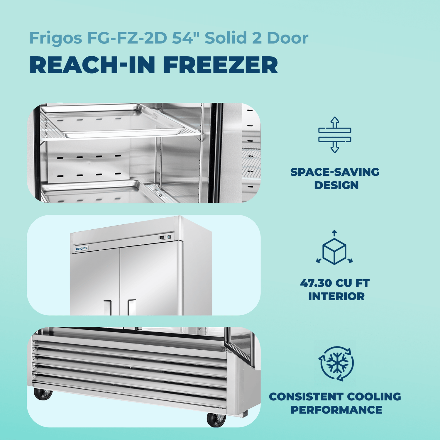 Commercial Reach in Freezer 54" Width Solid 2 Door 47 Cu Ft Frigos FG-FZ-2D with Aluminum Interior with 304 Stainless Steel Floor