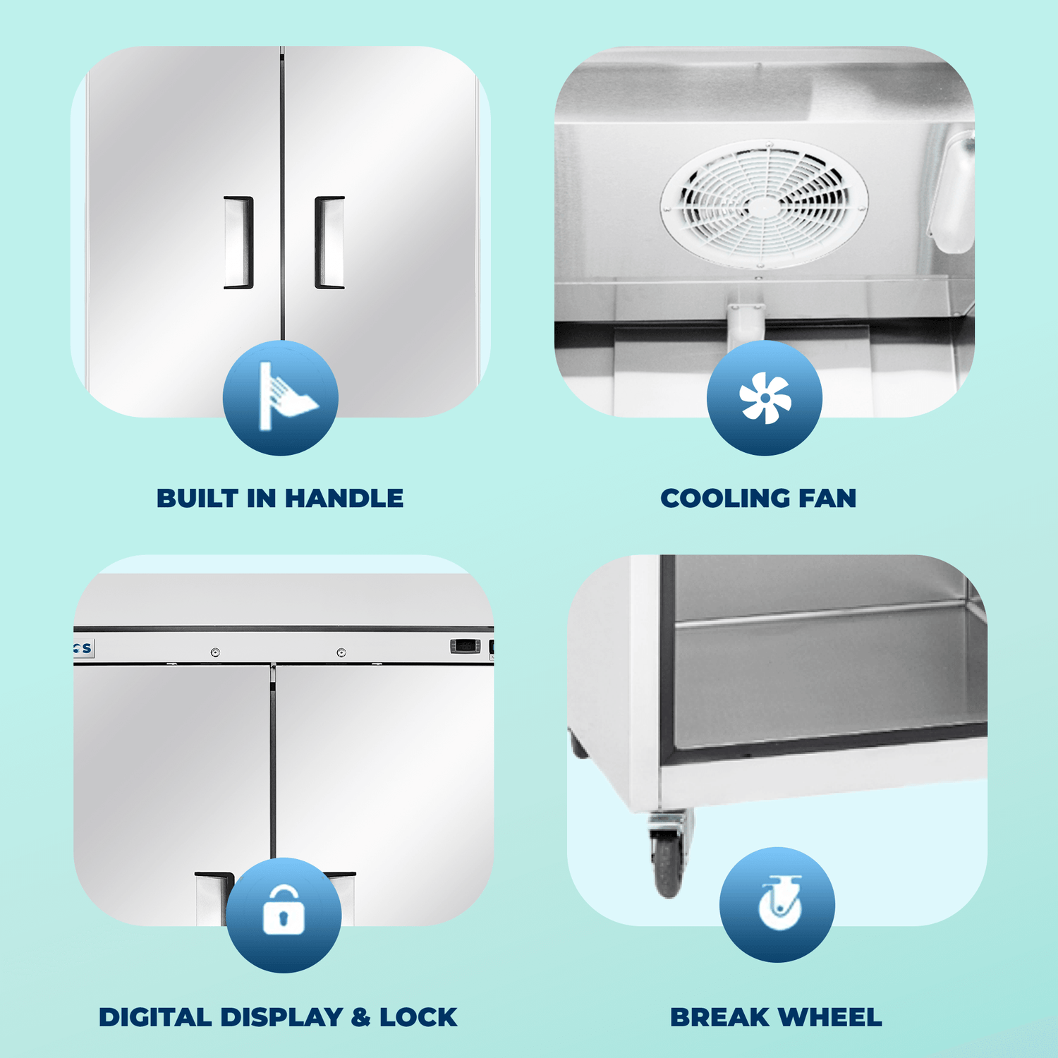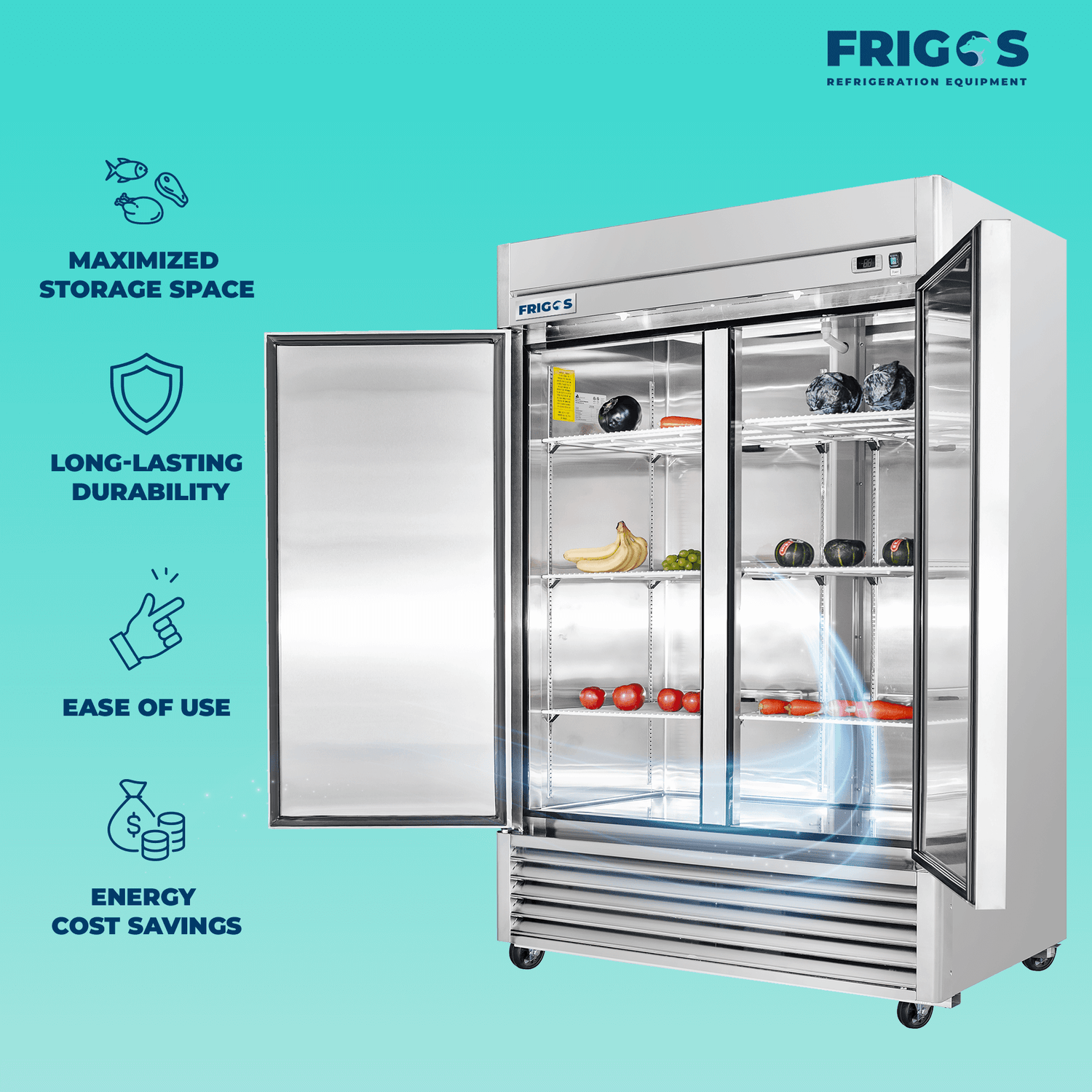 Commercial reach in freezer is equipped with six sturdy epoxy-coated shelves, each with the capacity to support up to 85 pounds, you'll find ample storage space for your ingredients and products. Our Frigos Commercial Reach In Freezer is designed to fit Hotel Pan Size of 12 x 20 inches. The internal LED lighting ensures outstanding visibility, simplifying the task of locating items within. The self-closing doors enhance convenience and energy efficiency, securely locking when required. The unit's mobility is facilitated by 4 7/8-inch casters, two of which can be locked into place for stability.