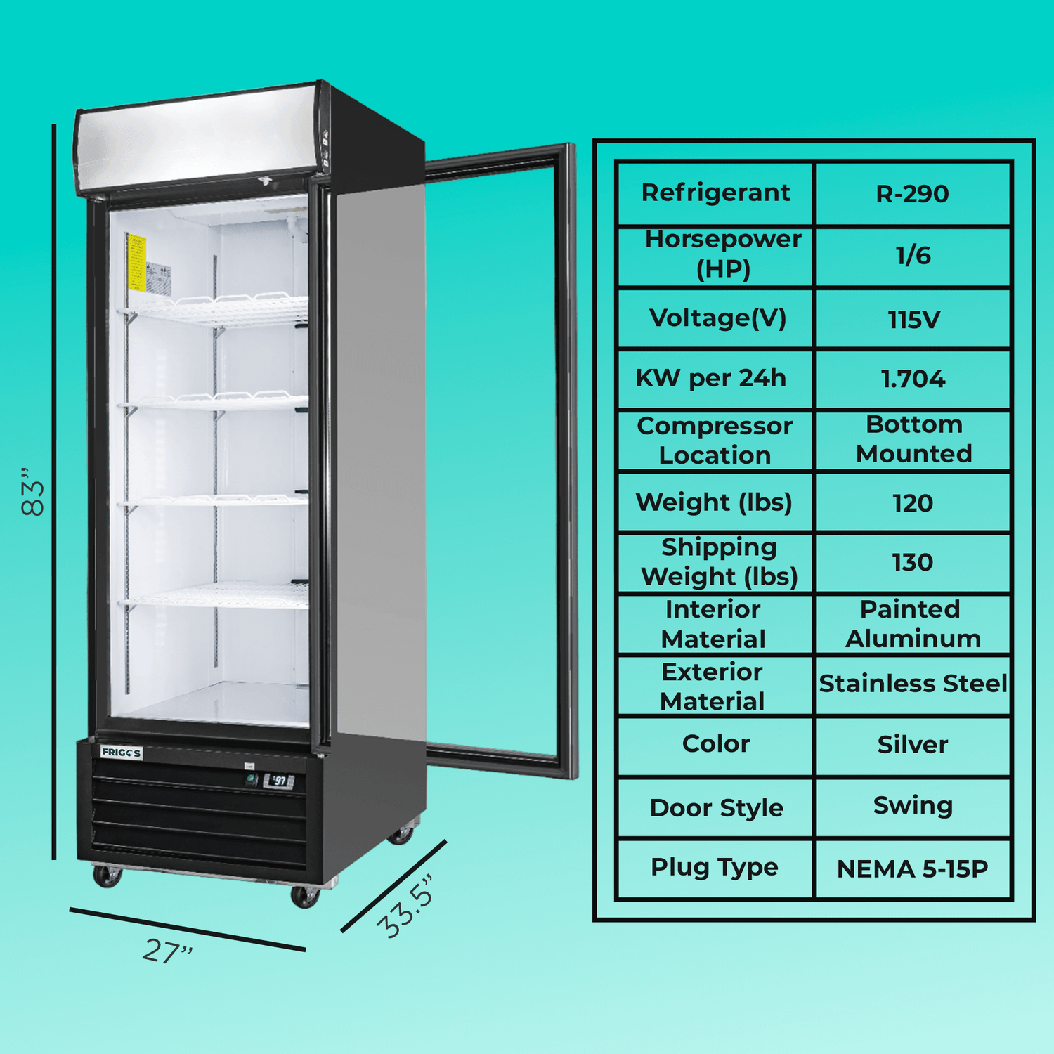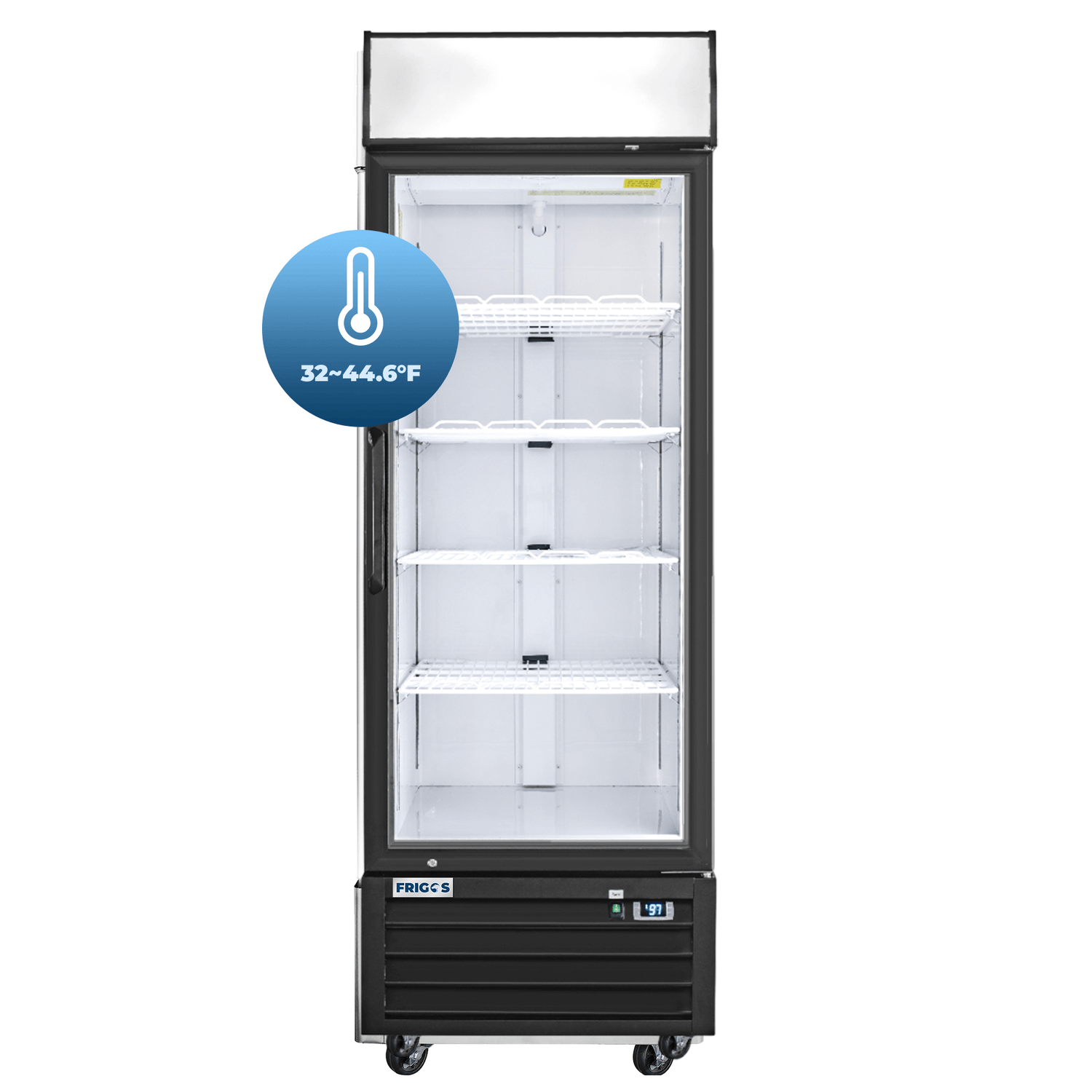 Merchandiser Refrigerator 27" Width Black Swing Glass 1 Door with LED Lighting Frigos FG-MR-1D-G with Aluminum Interior with 304 Stainless Steel Floor is backordered and will ship as soon as it is back in stock.