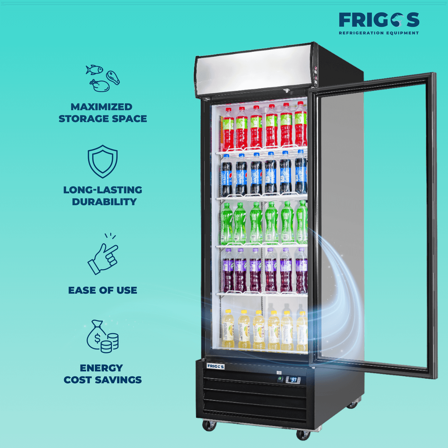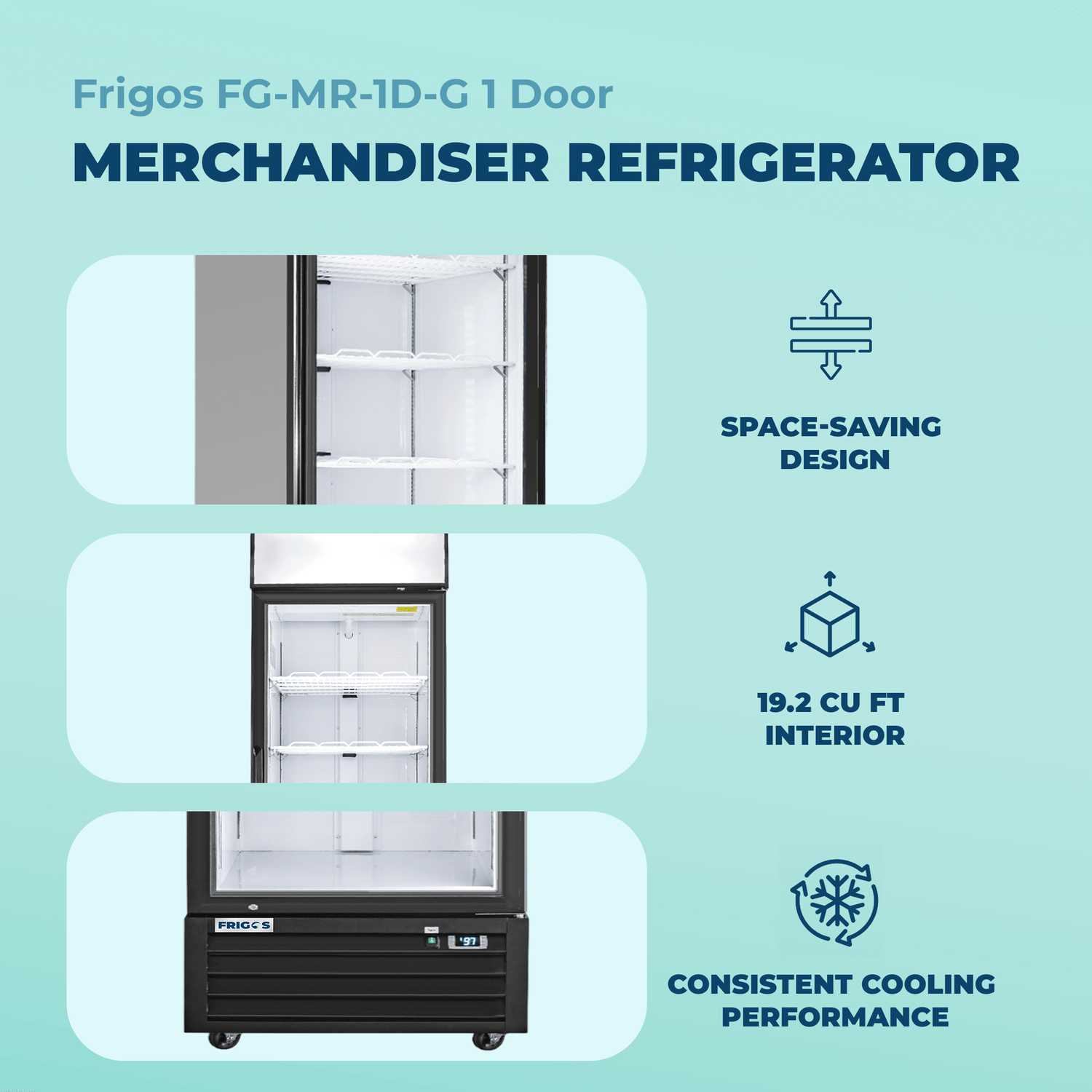 Invest in the future of your business with our FG-MR-1D-G one-door merchandiser glass door refrigerator, perfect for your merchandising needs. It's a powerful, energy-efficient, and reliable addition to any kitchen, designed to meet your needs for years to come. Explore our selection of commercial merchandising glass door refrigerators and other equipment to optimize your business operations. Elevate your offerings with Frigos.