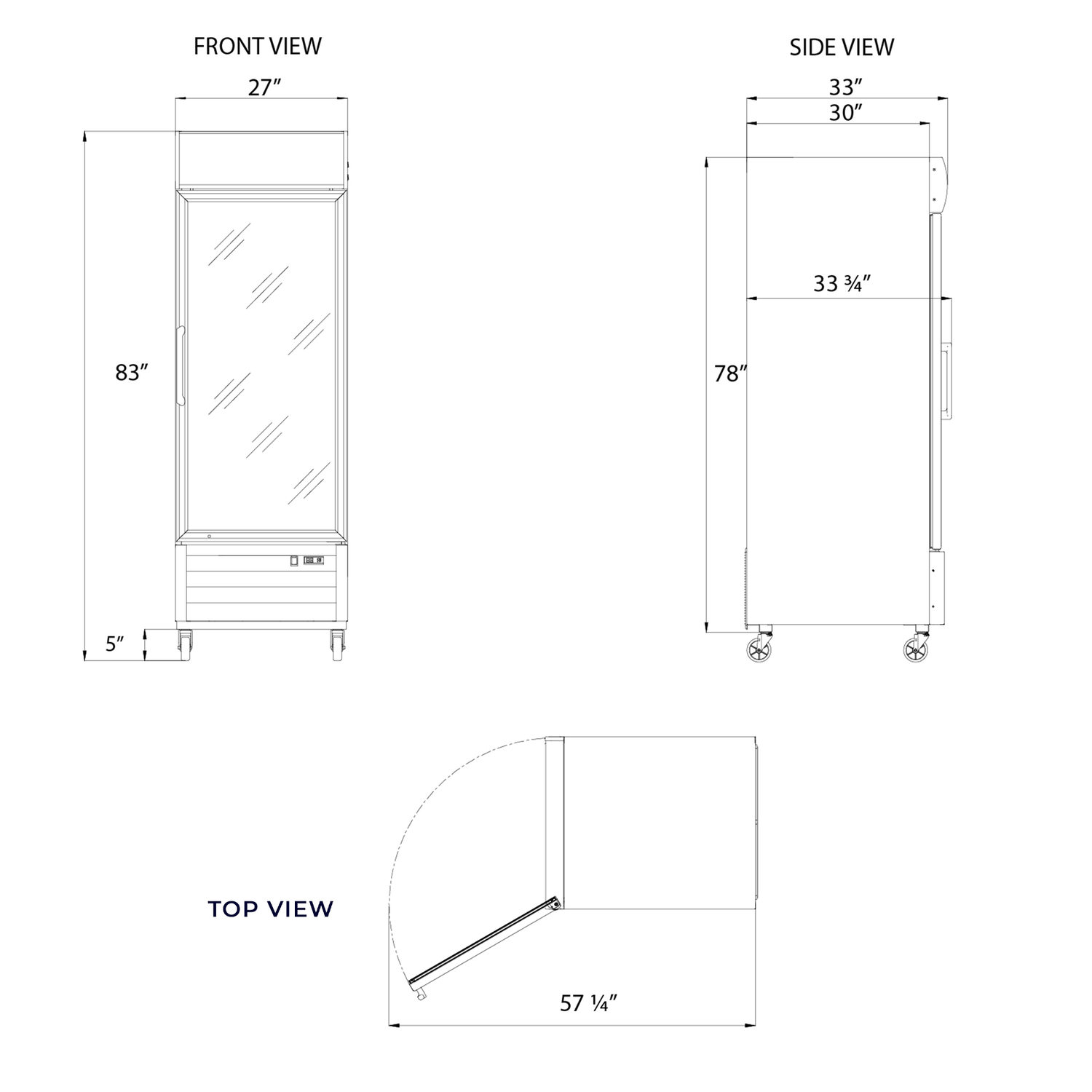 Introducing our premium one-door commercial merchandiser glass door refrigerator, model FG-MR-1D-G, meticulously designed to deliver outstanding performance and reliability for your commercial kitchen. This merchandising glass door refrigerator offers a spacious interior with precise measurements of 27 inches in width, 33 1/2 inches in depth, and 83 inches in height, providing ample storage with a capacity of 19.2 cubic feet, perfect for showcasing your products.