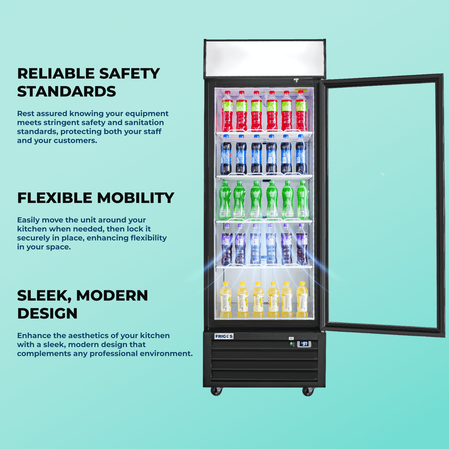 Merchandiser Refrigerator 27" Width Black Swing Glass 1 Door with LED Lighting Frigos FG-MR-1D-G with Aluminum Interior with 304 Stainless Steel Floor
