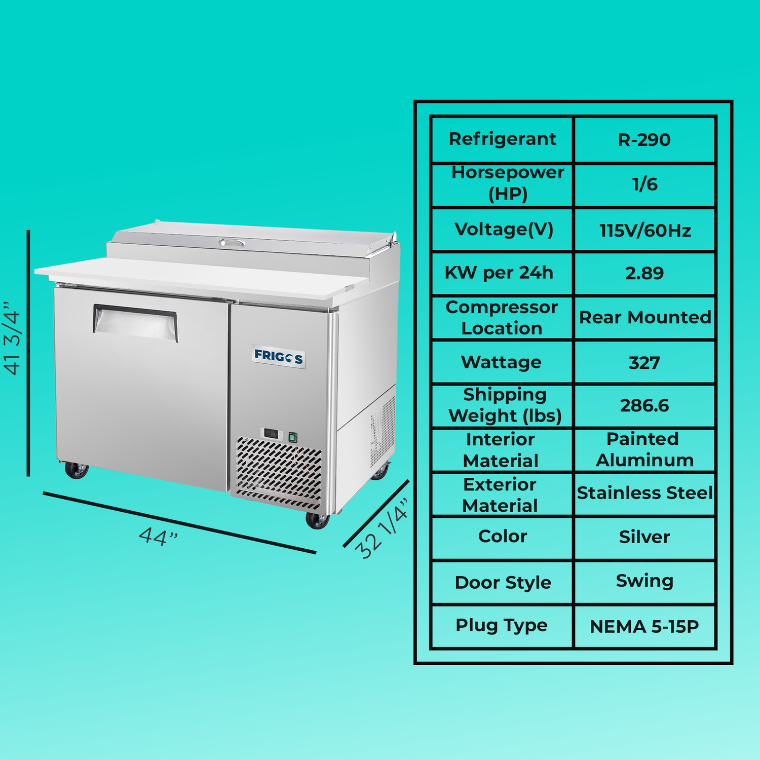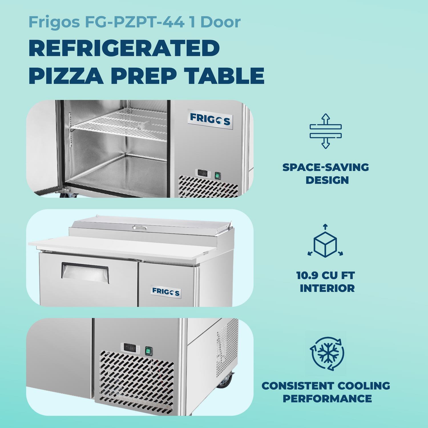 Pizza Prep Table Refrigerator 44" Width 1 Door Frigos FG-PZPT-44 with Aluminum Interior with 304 Stainless Steel Floor