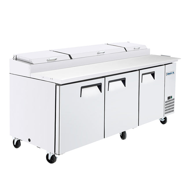 Frigos FGA-PZPT-3D-93 93" Three Solid Door Refrigerated Pizza Prep Table (12) 1/3 size pans is backordered and will ship as soon as it is back in stock.