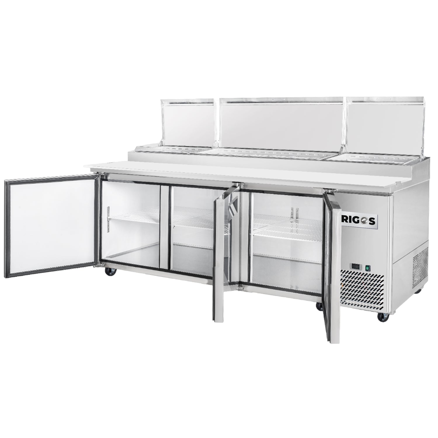 This pizza prep table features a spacious interior with precise measurements of 89 inches in width, 26 inches in depth, and 26.5 inches in height, providing an impressive storage capacity of 30.8 cubic feet to accommodate all your refrigerated items.