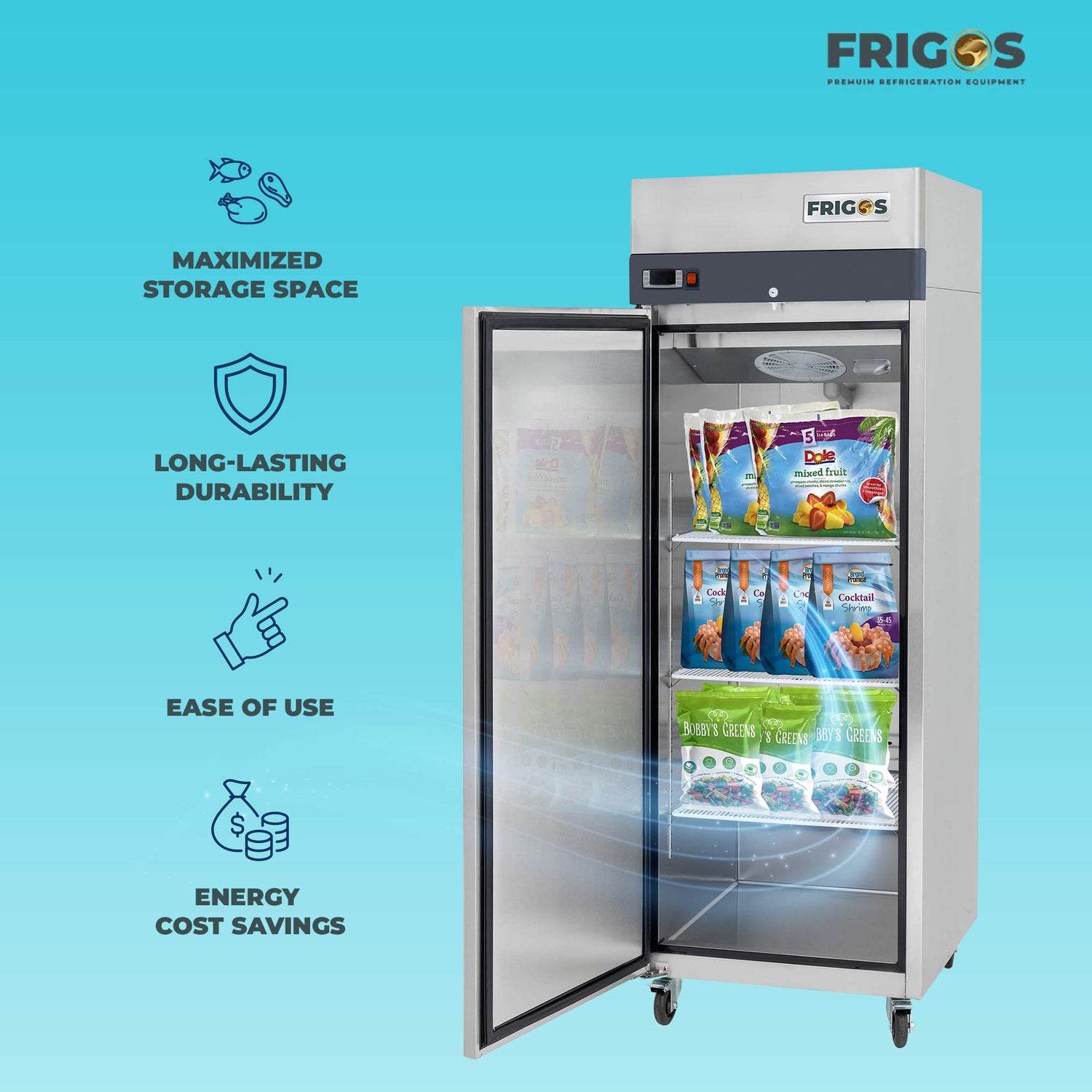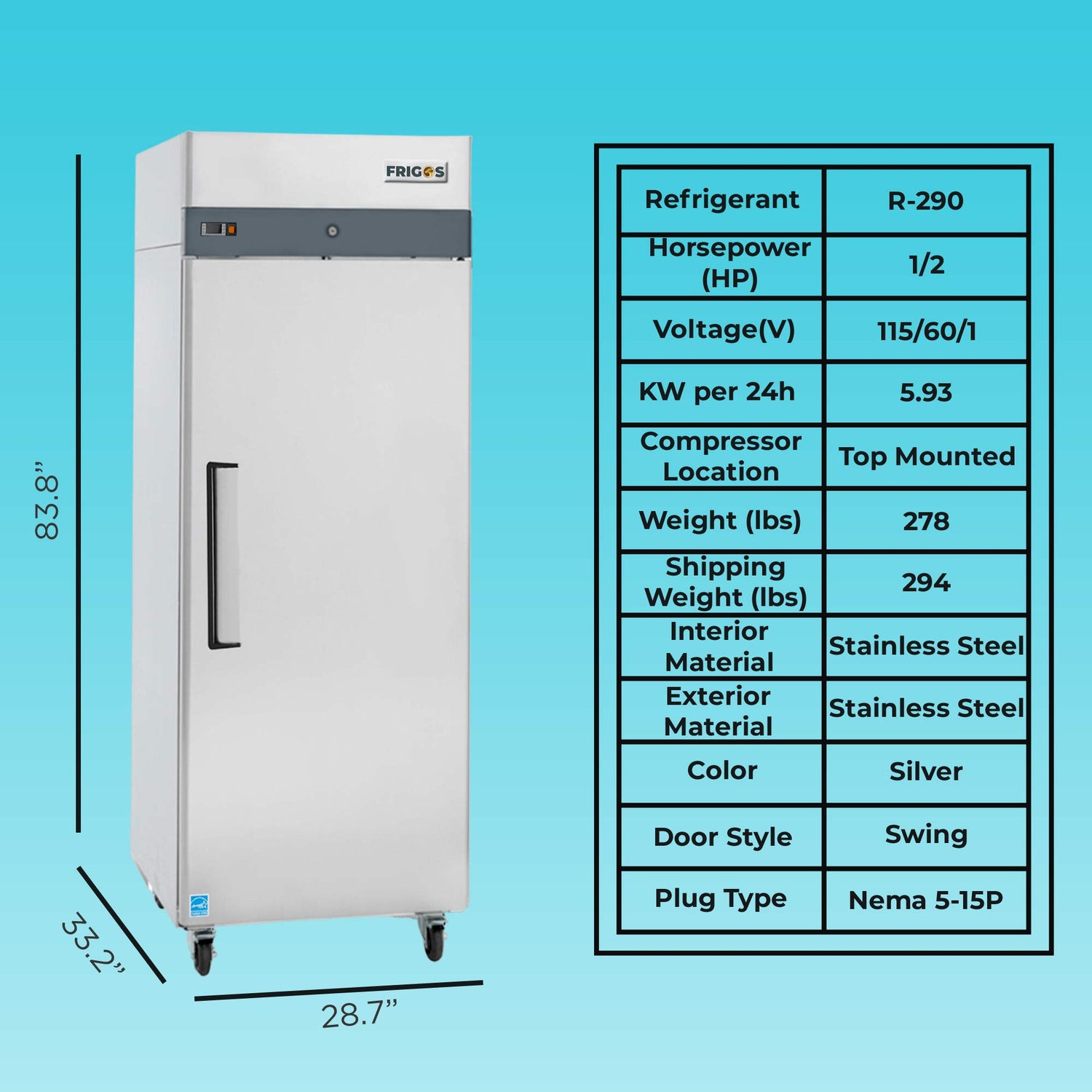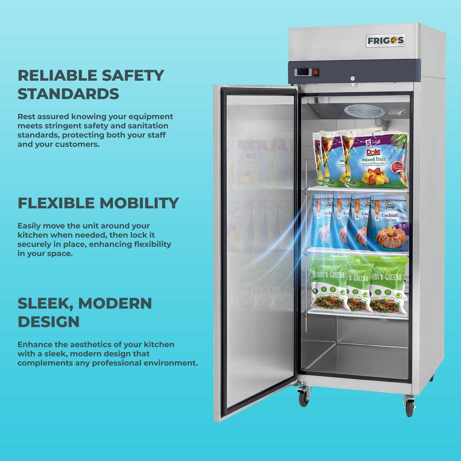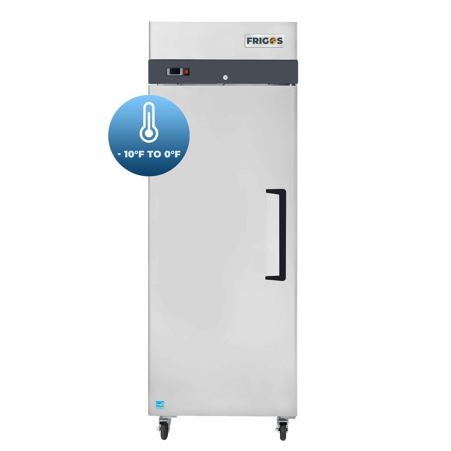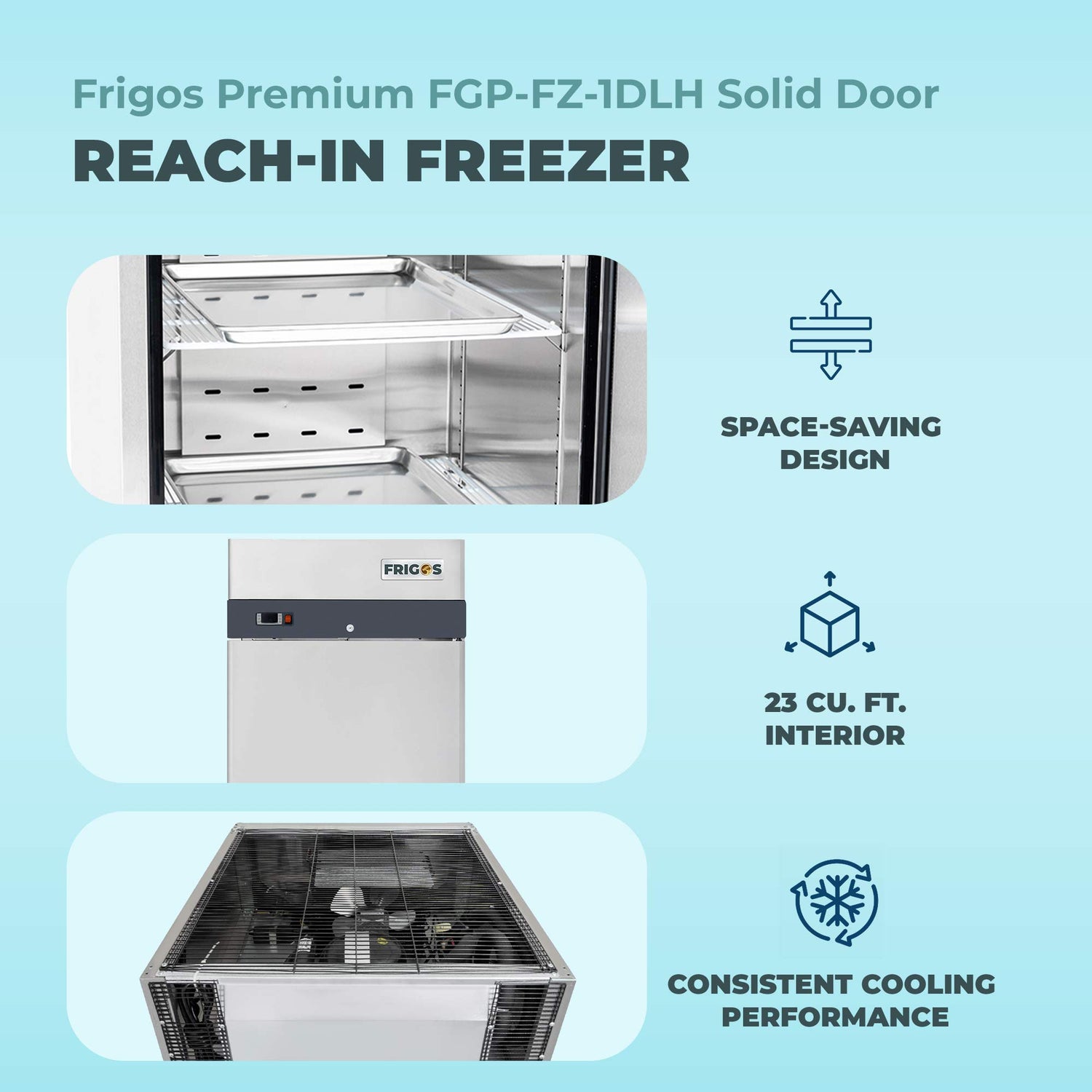 Commercial Reach in Freezer 2 Section Solid Door, 23 Cu Ft Frigos Premium FGP-FZ-1DLH Stainless Steel Interior and Exterior