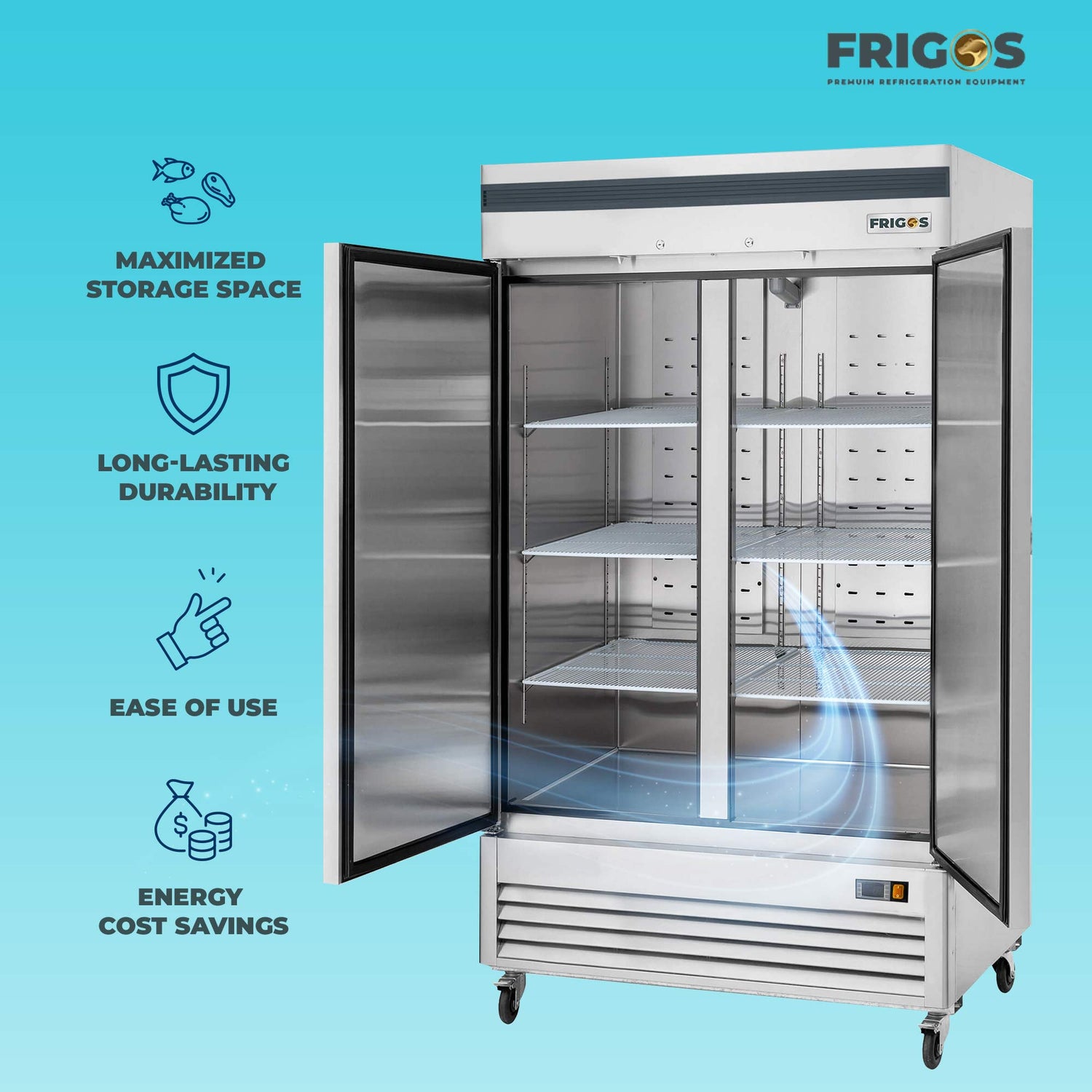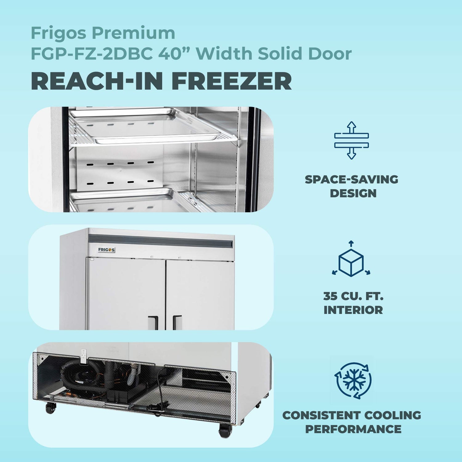 Enhance your kitchen’s freezing capacity with the Frigos Premium FGP-FZ-2DBC/40 40” Reach-In Double Solid Door Freezer, providing 35 Cu. Ft. of reliable storage for your commercial needs.
