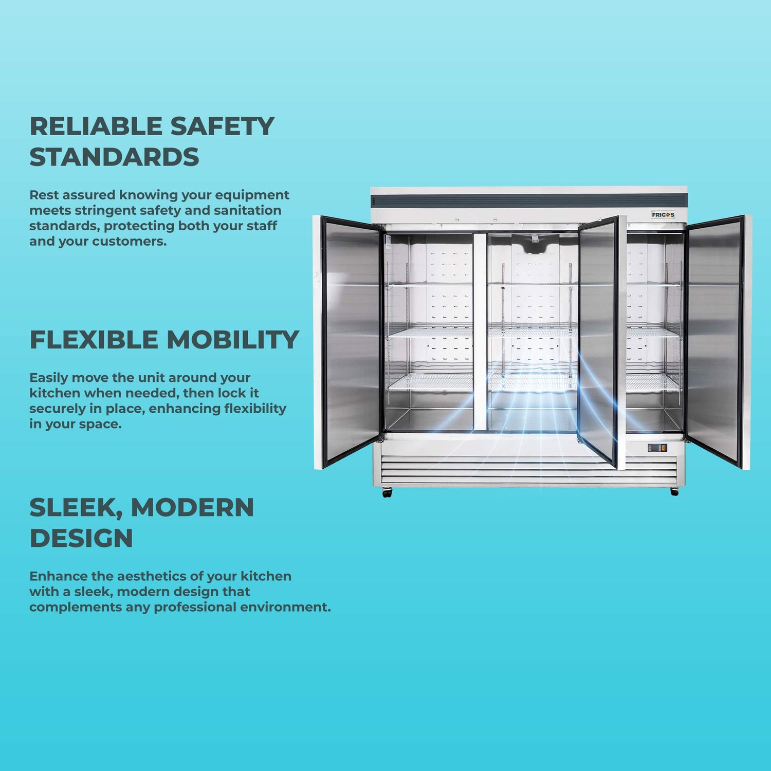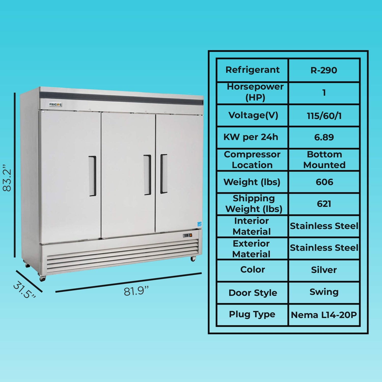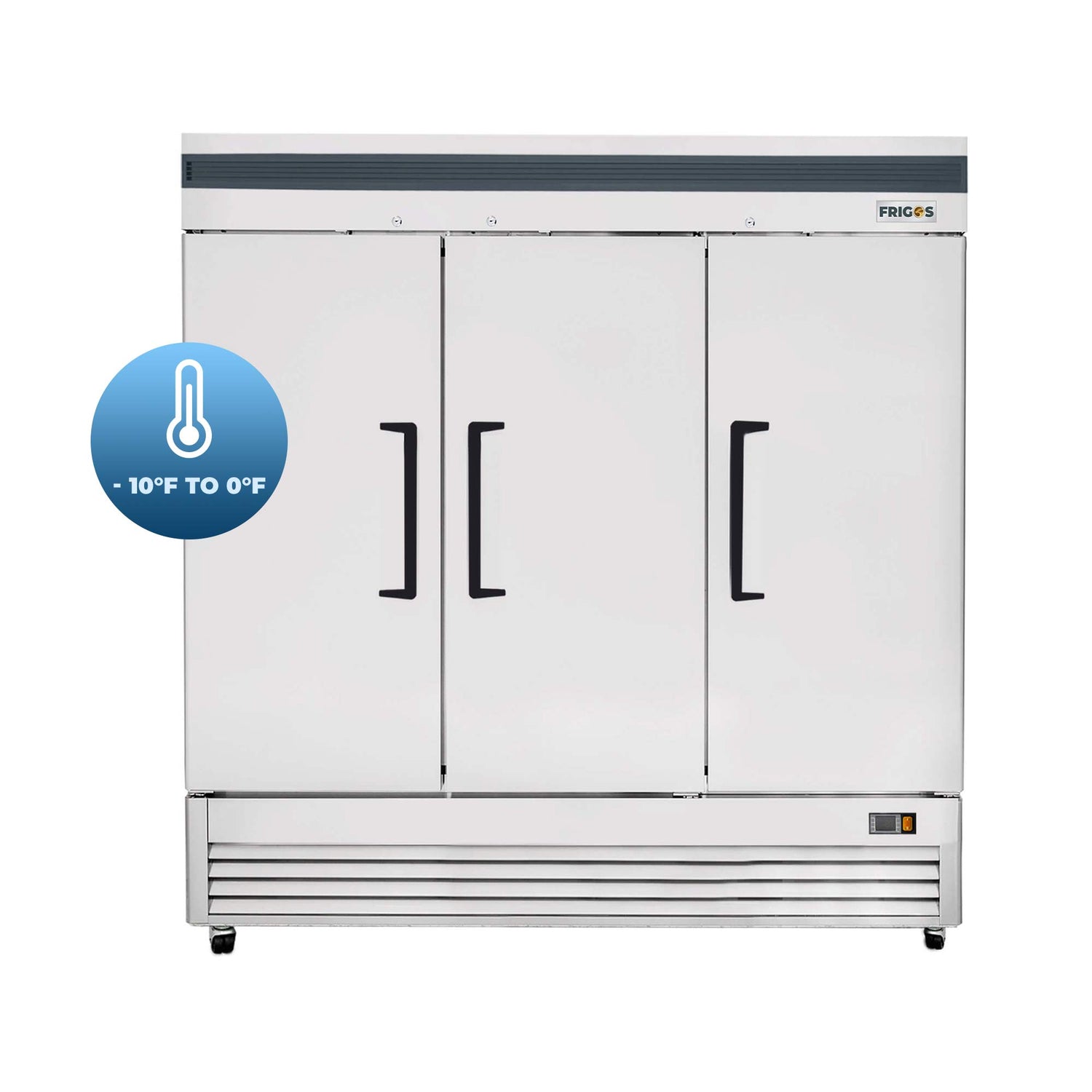 Commercial Reach in Freezer 3 Section Solid Door, 82" Width, 72 Cu Ft Frigos Premium FGP-FZ-3DBC Stainless Steel Interior and Exterior