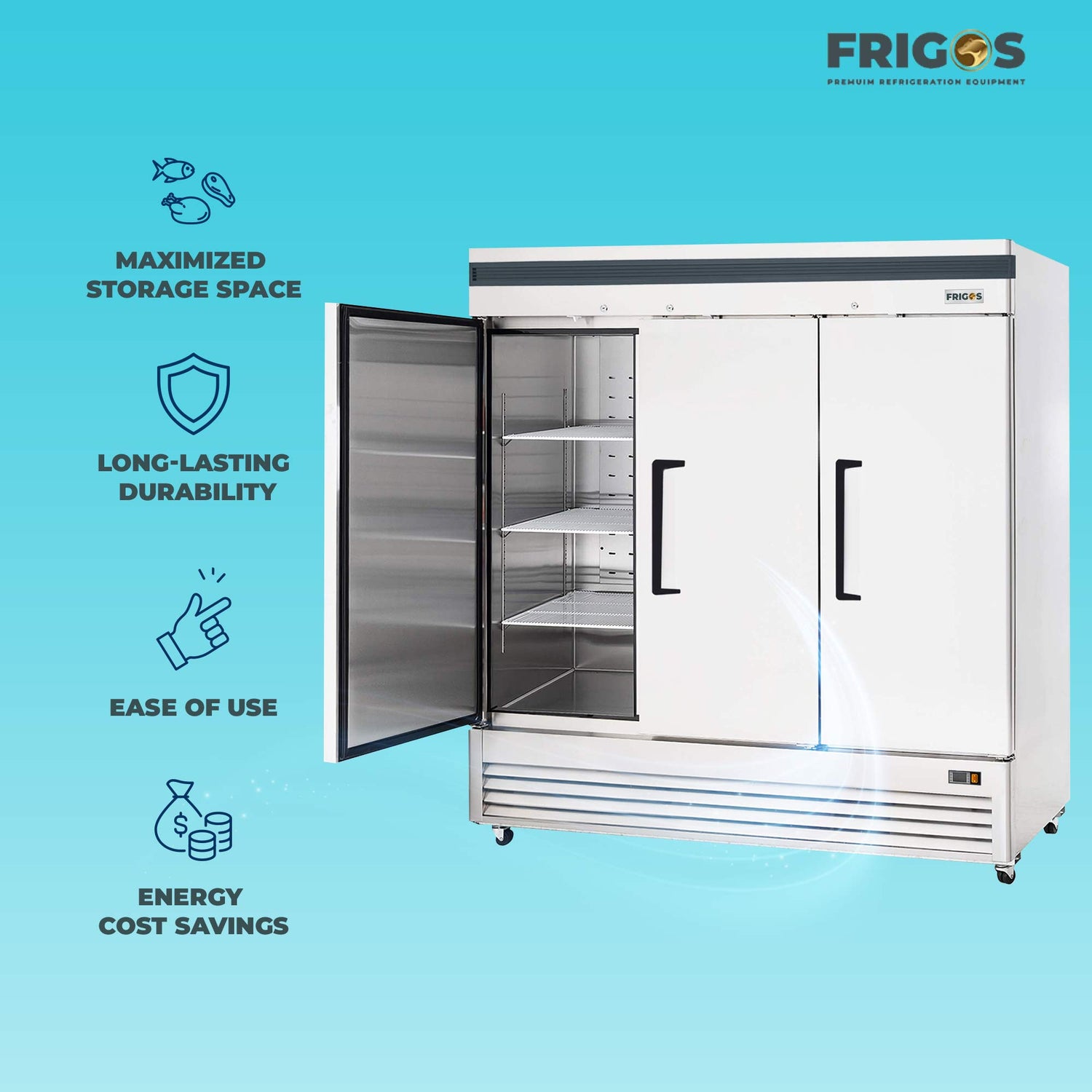 Upgrade your commercial kitchen with the Frigos Premium FGP-FZ-3DBC 82” Triple Solid Door Reach-In Freezer, offering 72 Cu. Ft. of spacious, organized storage for your frozen goods.