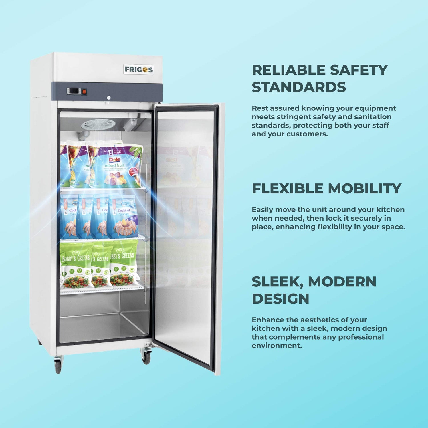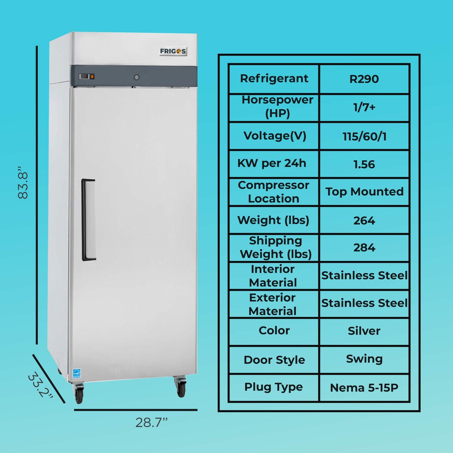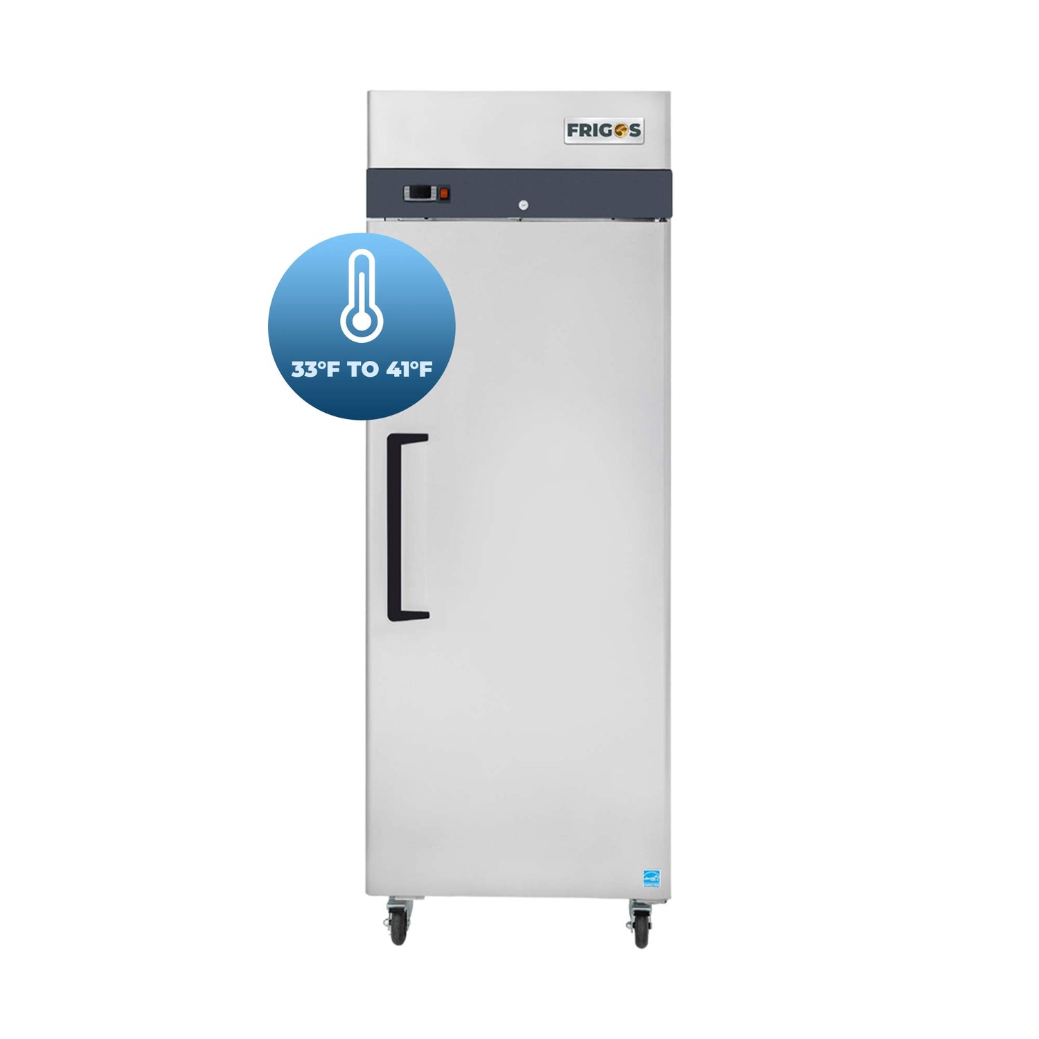 Commercial Reach in Refrigerator 1 Section Solid Door, 23 Cu Ft Frigos Premium FGP-RF-1D Stainless Steel Interior and Exterior