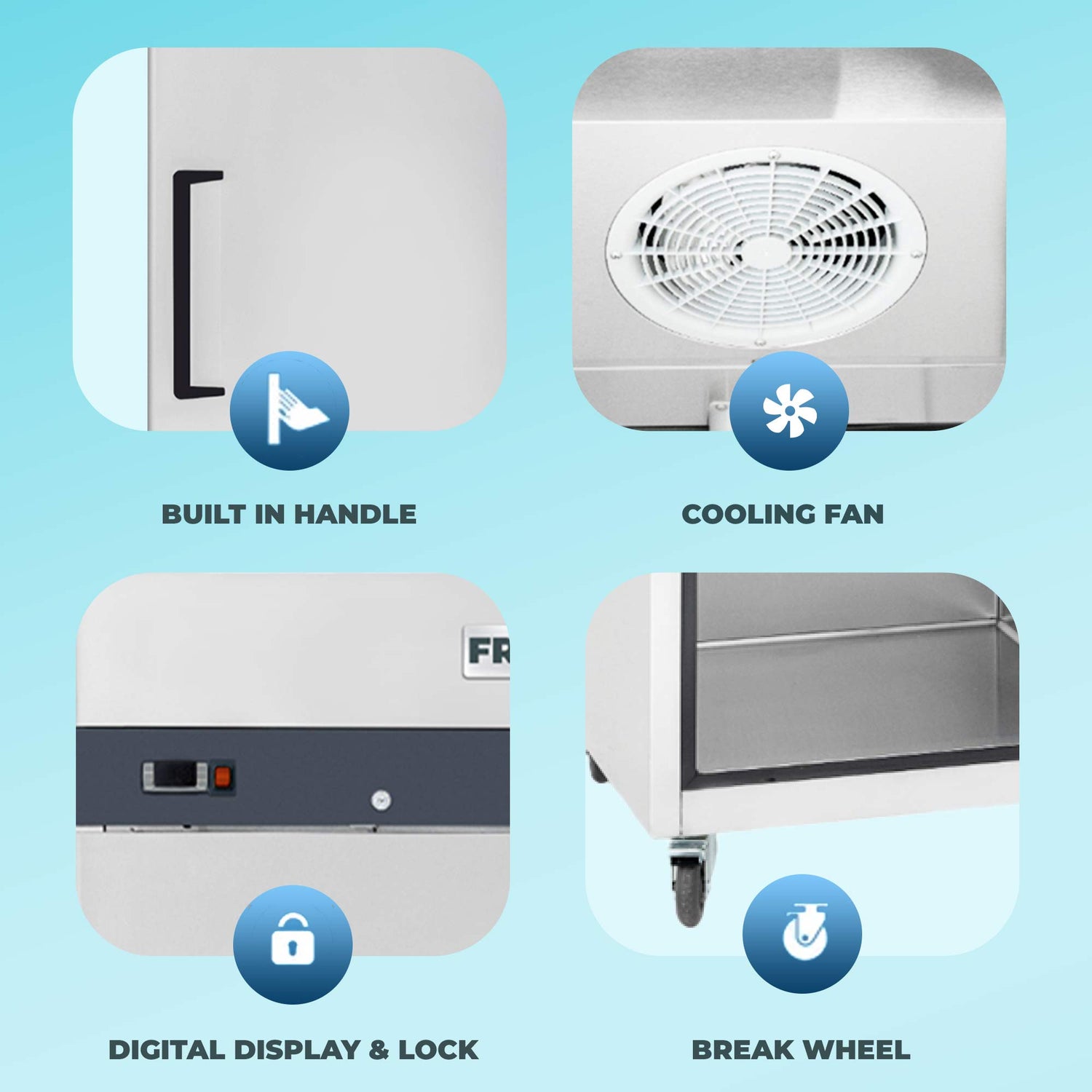 Stylish and Durable Construction: With a sleek silver exterior, four-inch caster wheels for easy mobility, and a robust stainless steel interior and exterior, the Frigos Premium FGP-RF-1D guarantees both style and durability, making it a dependable choice for efficient refrigeration in reach-in fridge.