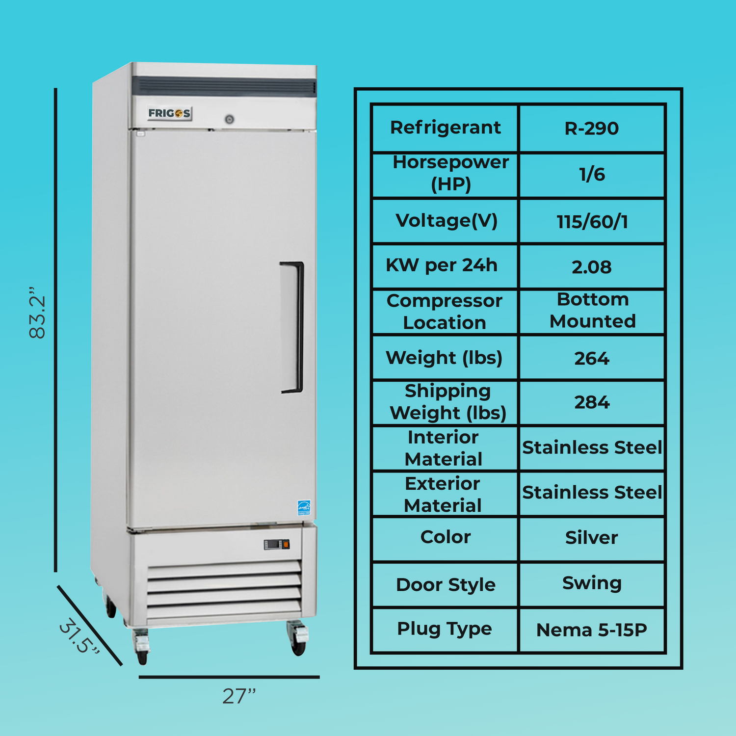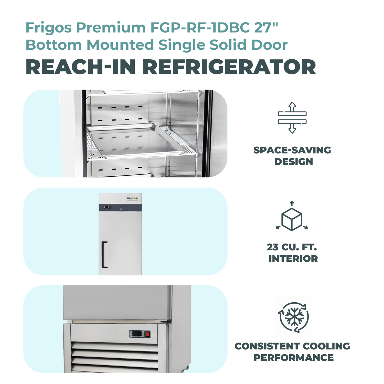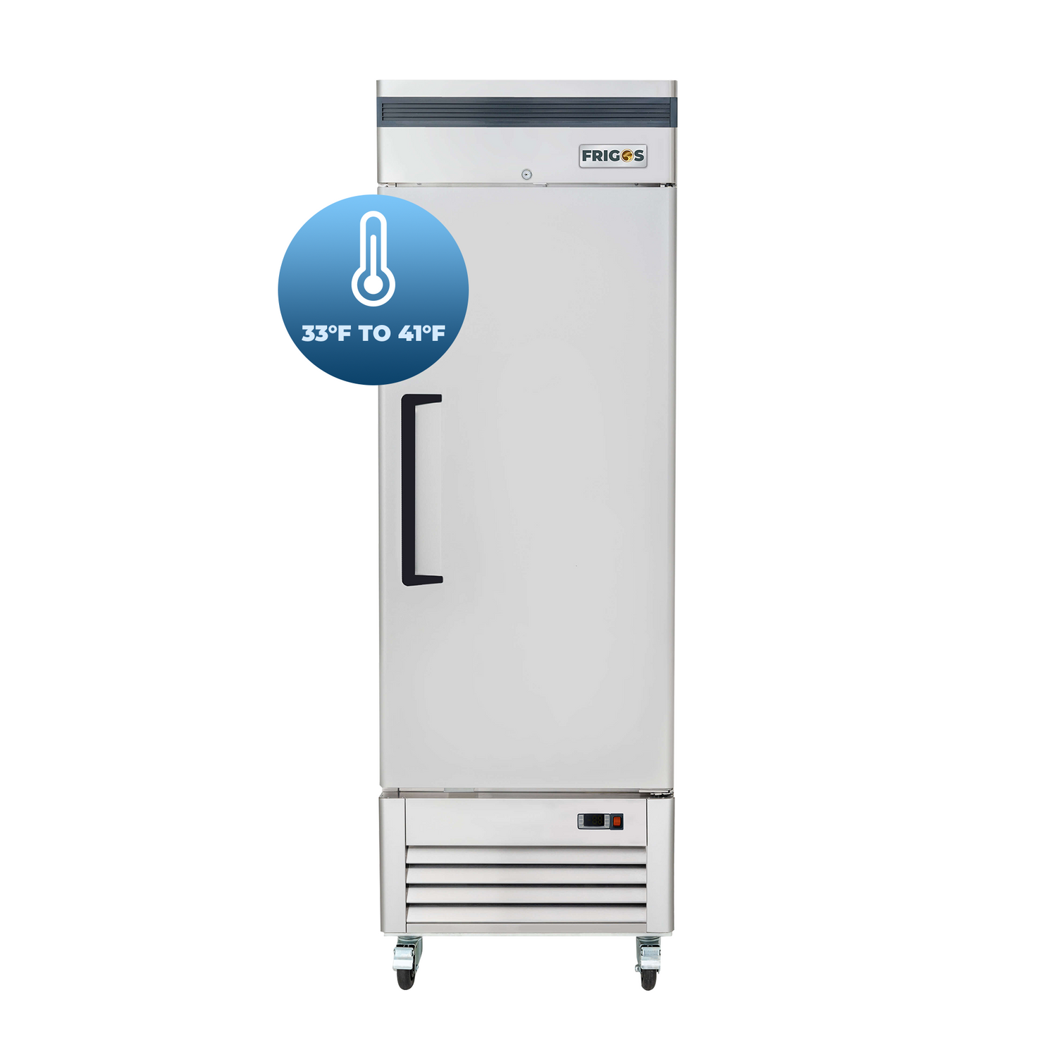 Commercial Reach in Refrigerator 1 Section Solid Door, 28" Width, 23 Cu Ft Frigos Premium FGP-RF-1DLH Stainless Steel Interior and Exterior