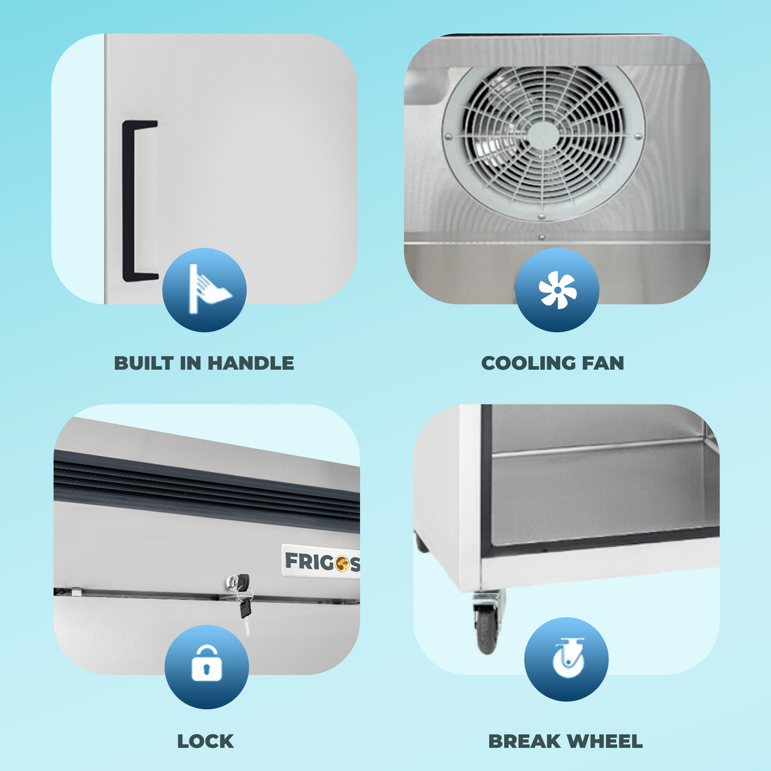 With a sleek silver exterior, four-inch caster wheels for effortless mobility, and a robust stainless steel interior and exterior, the Frigos Premium FGP-RF-1DLH offers both style and durability, making it a reliable choice for efficient refrigeration in reach-in fridge
