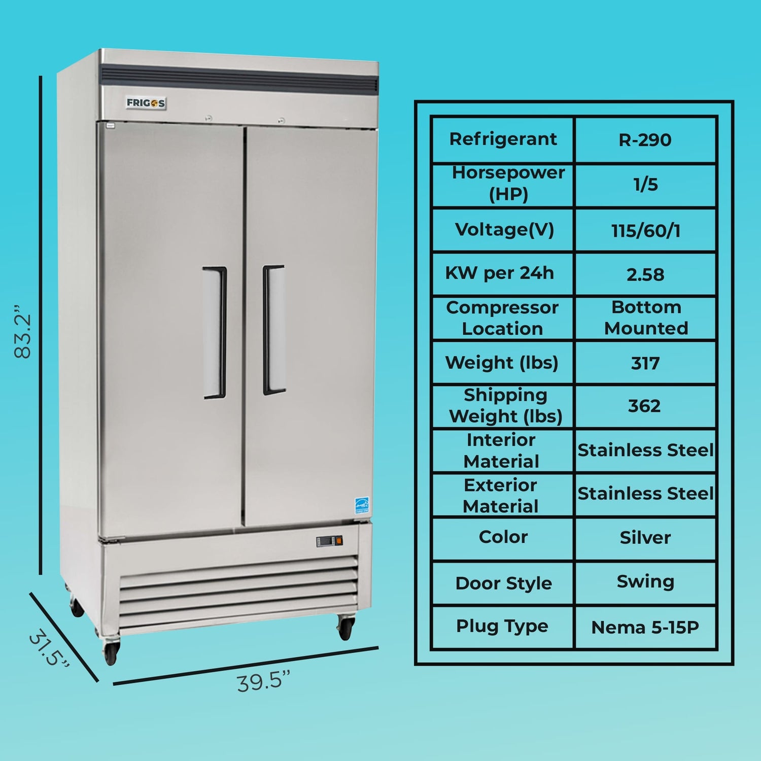 Commercial Reach in Refrigerator 2 Section Solid Door, 40” Width, 30 Cu Ft Frigos Premium FGP-RF-2DBC/40 Stainless Steel Interior and Exterior