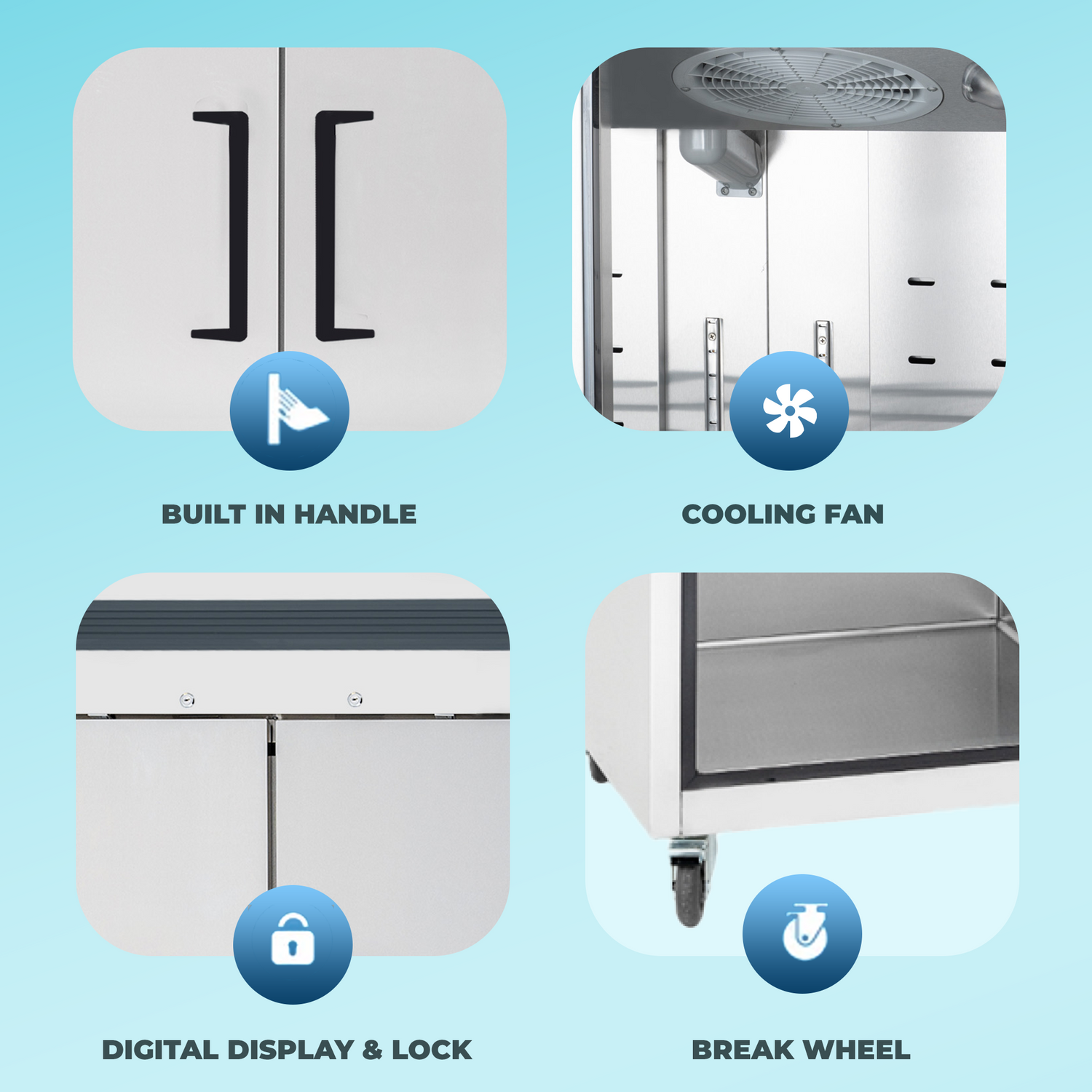 Advanced Temperature Control for Optimal Freshness: Frigos Premium FGP-RF-2DBC Double Door Commercial Refrigerator has been designed to maintain your food and ingredients at the perfect temperature-from 33°F to 41°F or within an optimal range-perishables will be maintained at their desired temperature for optimal freshness and quality in any commercial kitchen. Energy-Efficient & Environmentally Friendly: Equipped with environmentally friendly R-290 refrigerant, it only uses 3.24 KW in 24 hours to create a cost-efficient and greener alternative for refrigeration needs. Have your operational costs way lower while being kind to the environment, thanks to this energy-efficient appliance. Durable Stainless Steel with Mobility: The Frigos Premium FGP-RF-2DBC has a fully stainless steel exterior and interior to serve for years of lifespan and difficult-to-conquer kitchen arenas. Sleek in design, it adds professionalism to every space. Further, 4-inch caster wheels are fitted to provide ease in mobility for maintenance and shifting without trouble. This is the kind of double-door commercial refrigerator that every food service establishment would want to have for some reliable, energy-efficient, and eco-friendly refrigeration solution.