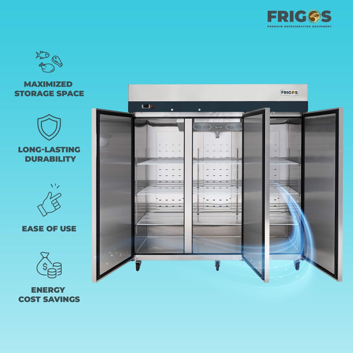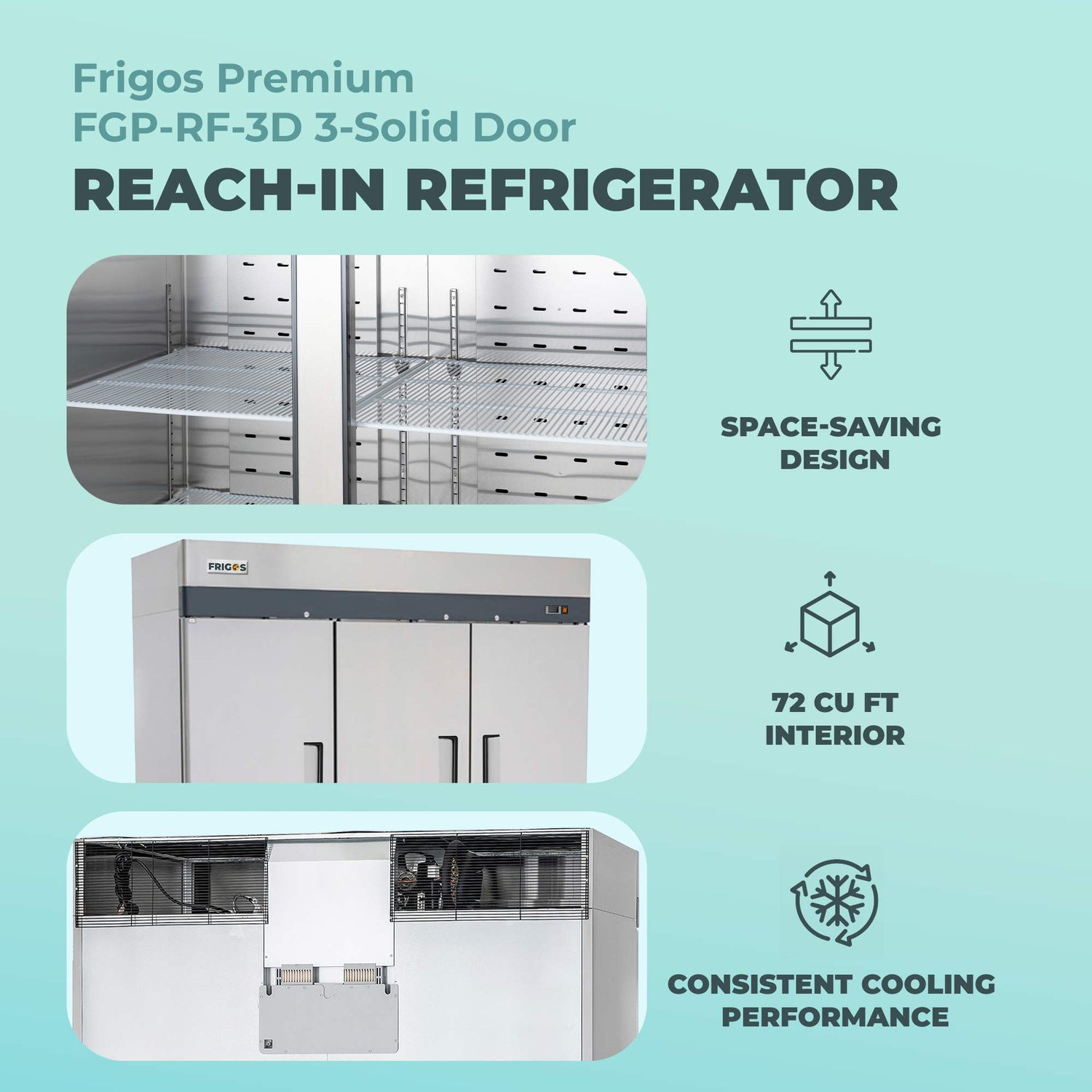 Elevate your kitchen's cold storage with the Frigos Premium FGP-RF-3D 72 Cu Ft 3-Door Reach-In Refrigerator, designed to keep your ingredients fresh and organized.