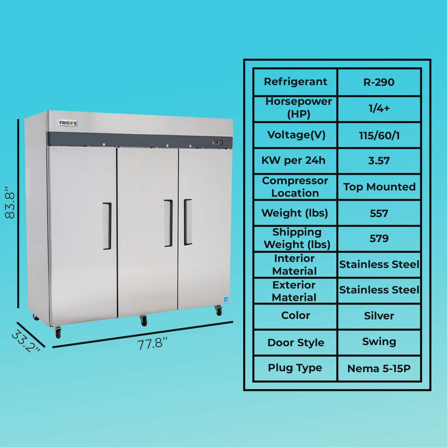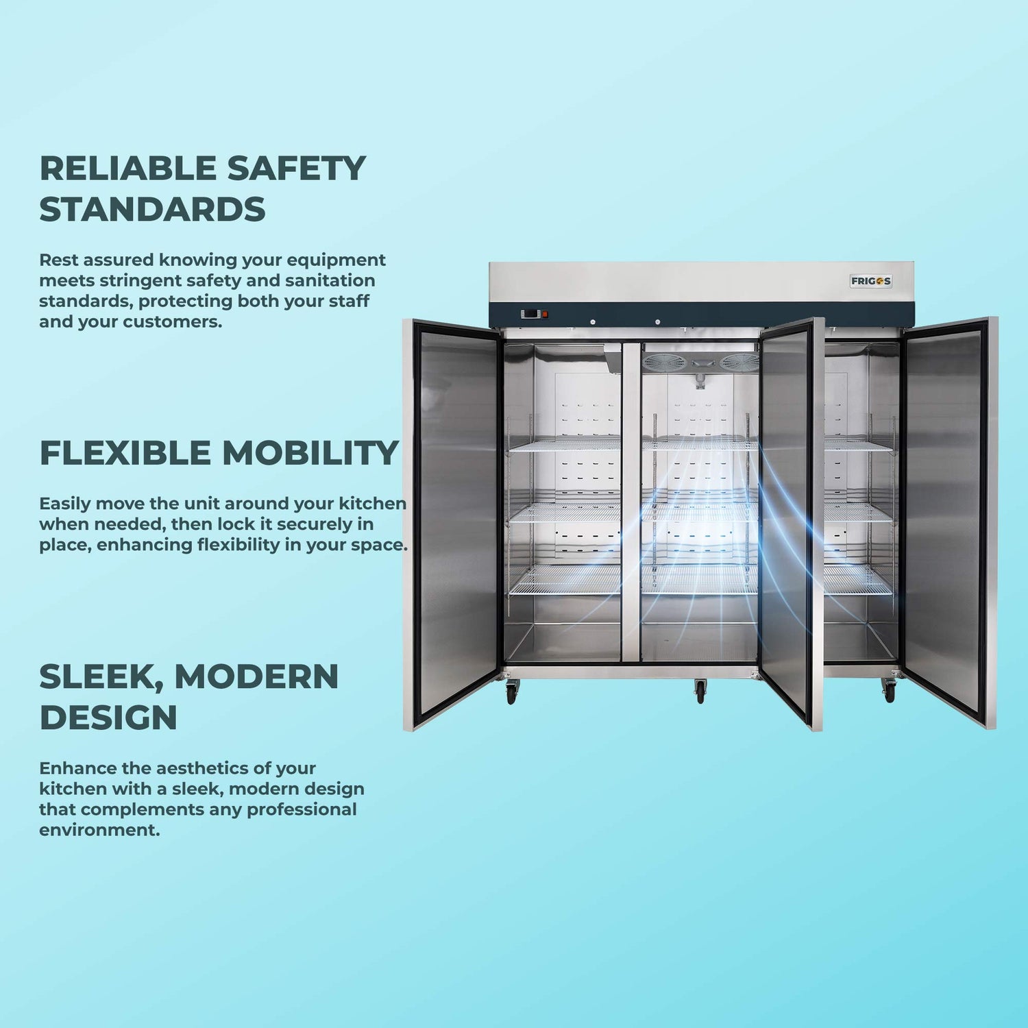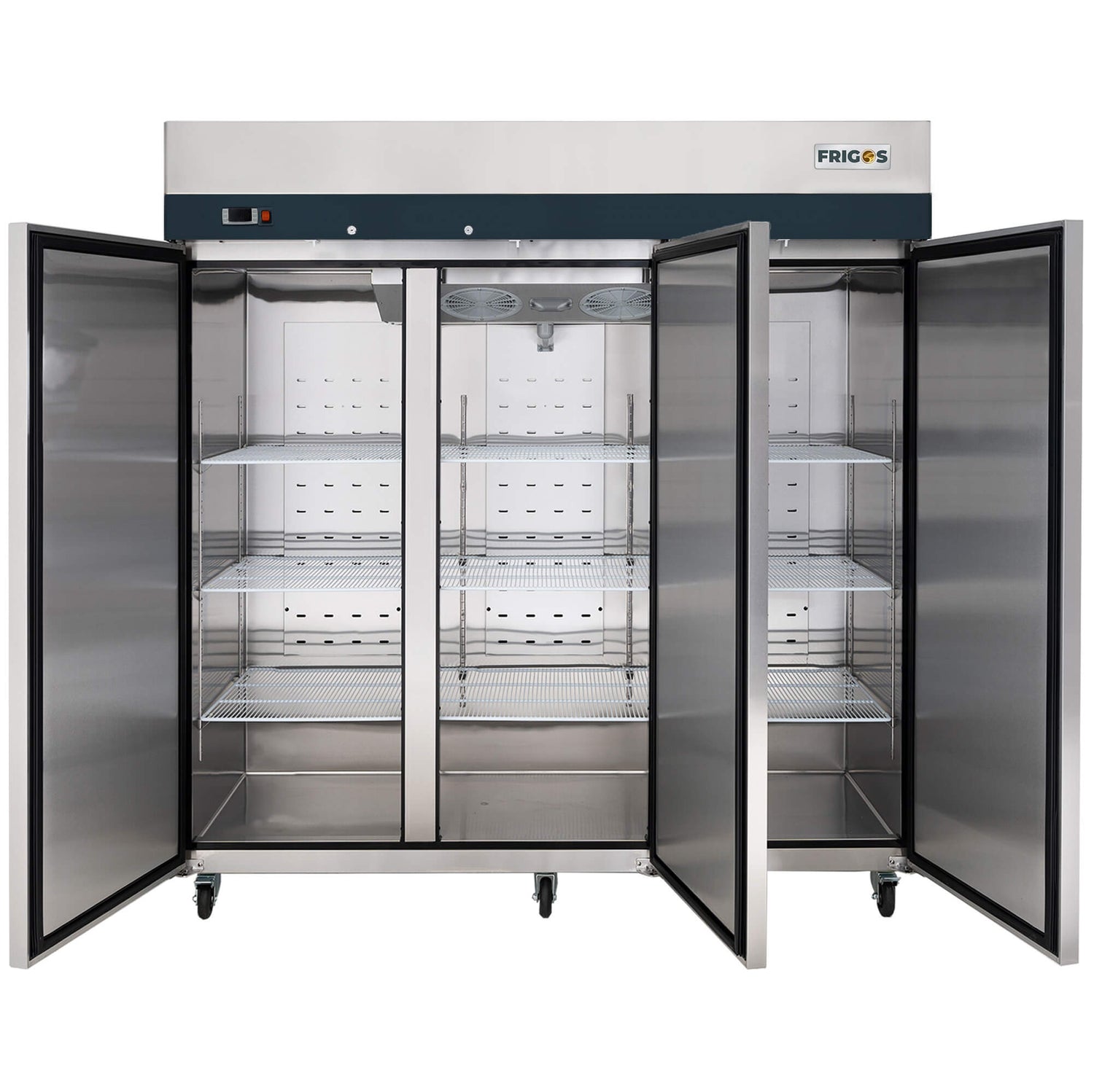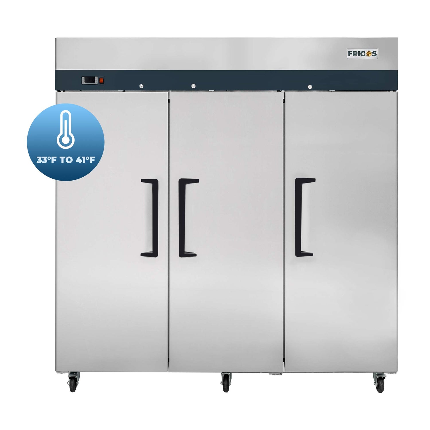 Commercial Reach in Refrigerator 3 Section Solid Door, 78" Width, 72 Cu Ft Frigos Premium FGP-RF-3D Stainless Steel Interior and Exterior