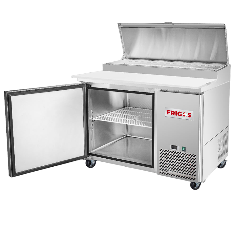 Certified by ETL Electrical, ETL Sanitation, and DOE, our pizza prep table with stainless steel construction ensures it meets rigorous health and safety standards. The sleek silver finish and swing-style solid door provide a professional look while granting easy access to your ingredients. Renowned for quality, the Frigos brand stands behind this pizza prep table, making it an ideal choice for the foodservice industry or any commercial kitchen. Depend on the FGV-PZPT-44 to maintain optimal temperatures, ensuring the freshness and quality of your products. Elevate your business with our FGV-PZPT-44 one-door pizza prep table, a robust and energy-efficient solution tailored for your pizza preparation needs. Explore our full range of pizza prep tables and equipment to enhance your pizza-making process.
