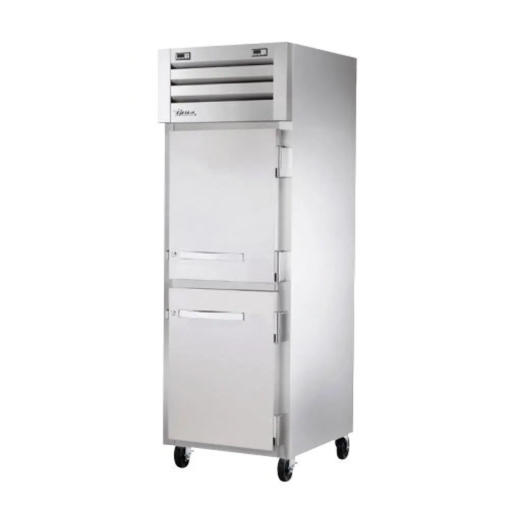 Experience unmatched refrigeration and freezing with the True Refrigeration STA1DT-2HS-HC. This dual-temperature refrigerator/freezer, part of the True Spec Series, delivers top-notch performance and durability. It combines an independent refrigerator unit in the top section with a separate freezer unit in the bottom, providing both chilled and frozen storage in a compact footprint. Top-mounted compressors protect against damage, while six adjustable chrome wire shelves offer versatile organization.