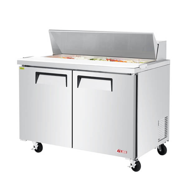 Optimize your restaurant's efficiency with the Turbo Air EST-48-N 2-door refrigerated sandwich prep table. Featuring an aluminum exterior, galvanized steel back and bottom, and a stainless steel and aluminum interior, this prep table is both durable and easy to clean. It accommodates (12) 1/6 size, 4" deep pans that come included, allowing you to start serving sandwiches immediately.