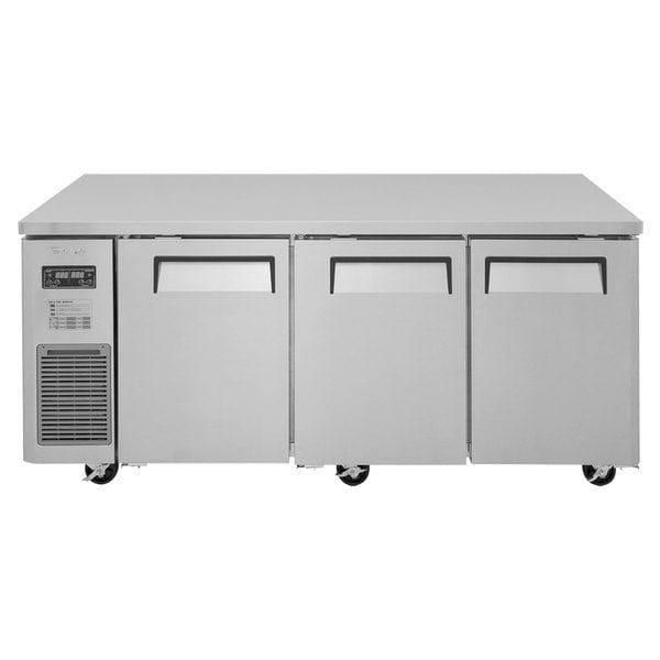 The Turbo Air JURF-72-N undercounter refrigerator/freezer offers a versatile solution with two refrigerator sections and one freezer section. Each section features a polyethylene-coated wire shelf for product storage. The interior is constructed from aluminum and stainless steel, ensuring easy cleaning and resistance to corrosion. The exterior is made from galvanized and stainless steel for durability. Additionally, the top of the unit provides space for food prep equipment.